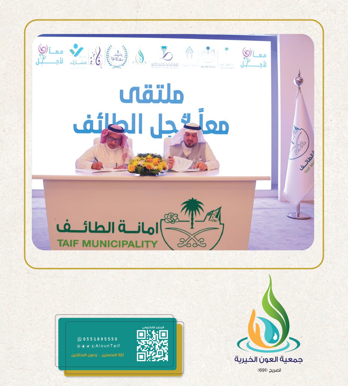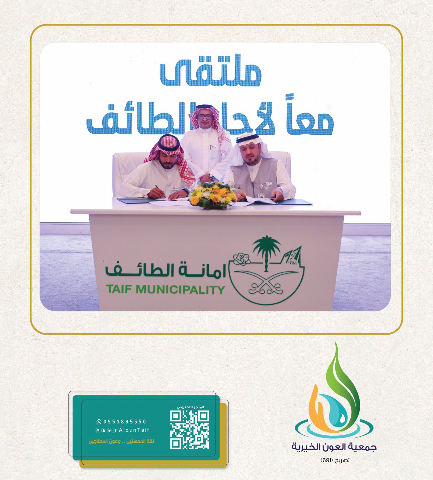 ضمن ملتقى “معًا لأجل الطائف” وبتعاون مع أمانة الطائف وقعت الجمعية ممثلة برئيس مجلس الإدارة د. محمد سيحان القريني مذكرة تعاون مع أمانة الطائف لتفعيل مبادرة وزارة الشؤون البلدية والقروية والإسكان ( المتاجر المتنقلة ) من خلال تأمين الجمعية لعدد 60 نقطة بيع لتمكين الباعة والأعمال الحرفية والأسر المنتجة من المواطنين والمواطنات وإيجاد حاضنات مخدومة لإنتاجهم وأعمالهم, و ضمن مبادرات القطاع الثالث في برامج وزارة الشؤون البلدية والقروية تم توقيع اتفاقية تعاون مع الإسكان التنموي وذلك لتوفير السكن للأسر الأشد حاجة في المجتمع , وتم كذلك توقيع اتفاقية تعاون مع الغرفة التجارية بالطائف للتعاون في مجال المسؤولية الاجتماعية وتفعيل روابط التعاون والعمل المشترك مع مؤسسات المجتمع .