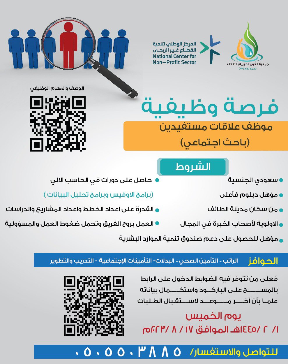 تعلن جمعية العون الخيرية بالطائف عن وجود شاغر وظيفي بمسمى علاقات مستفيدين ( باحث اجتماعي )