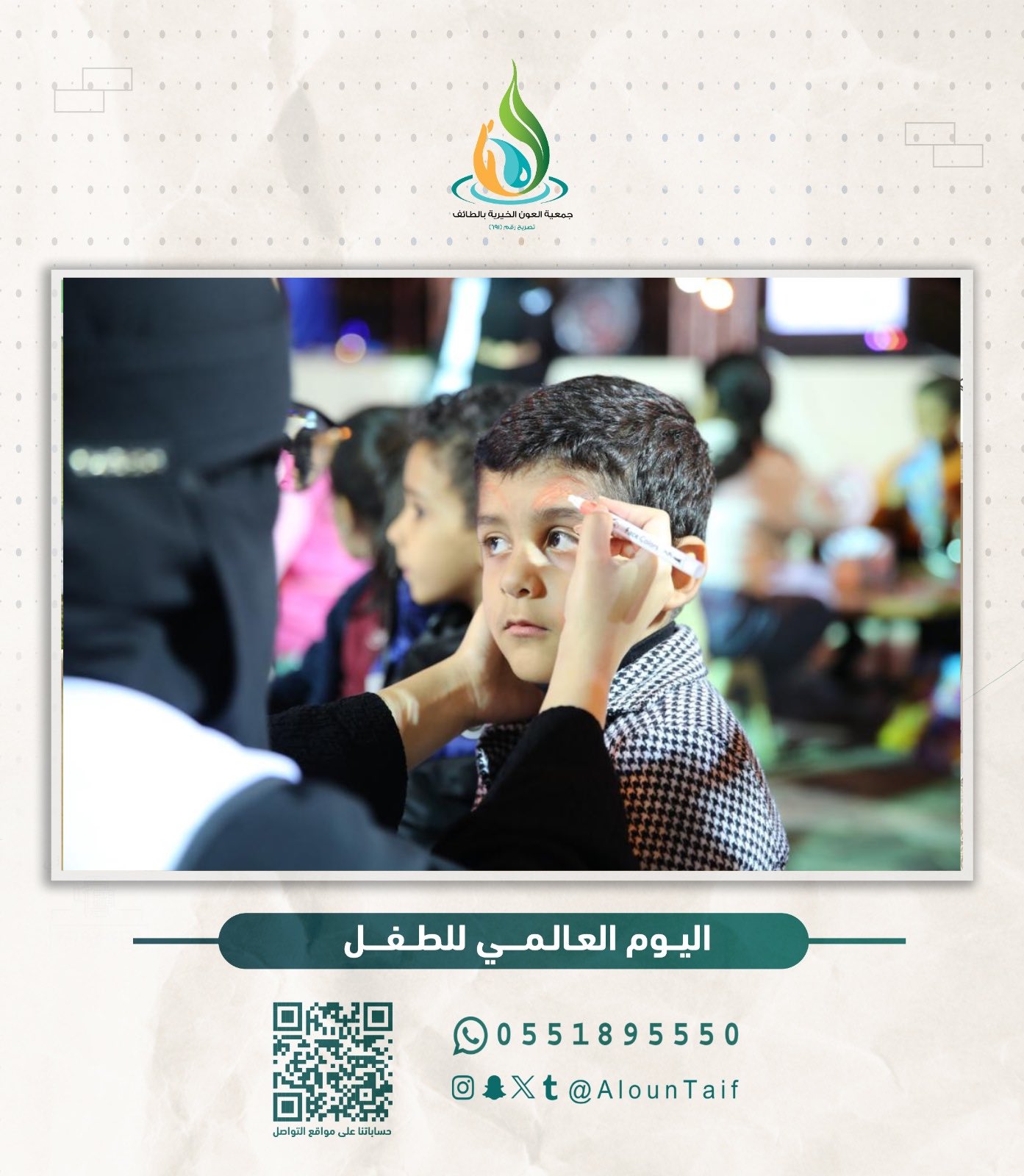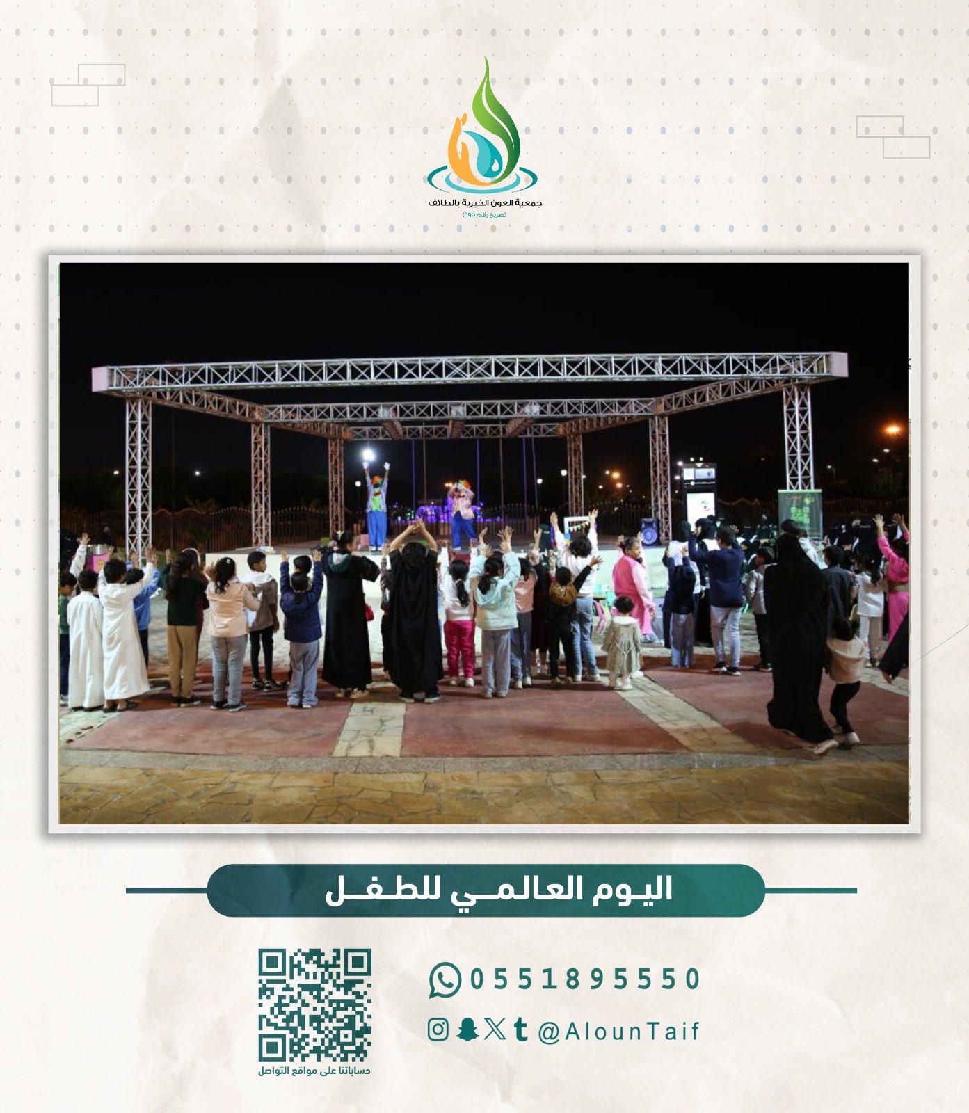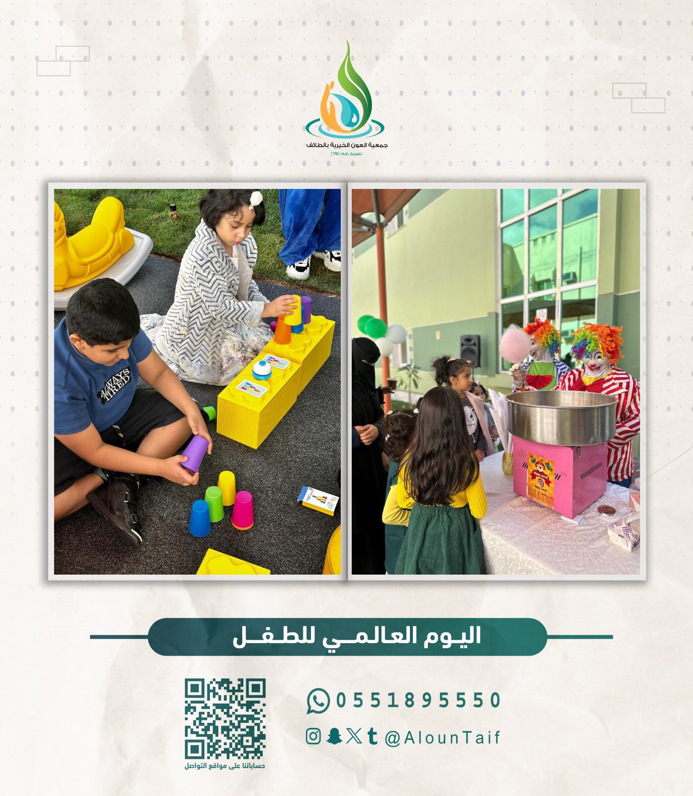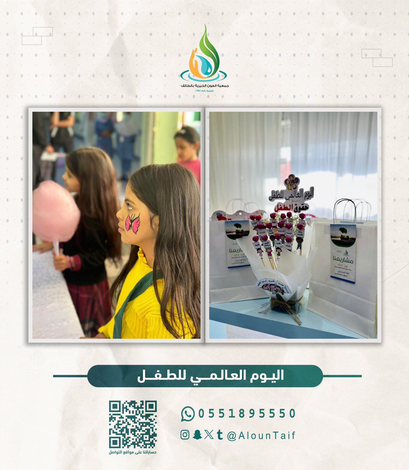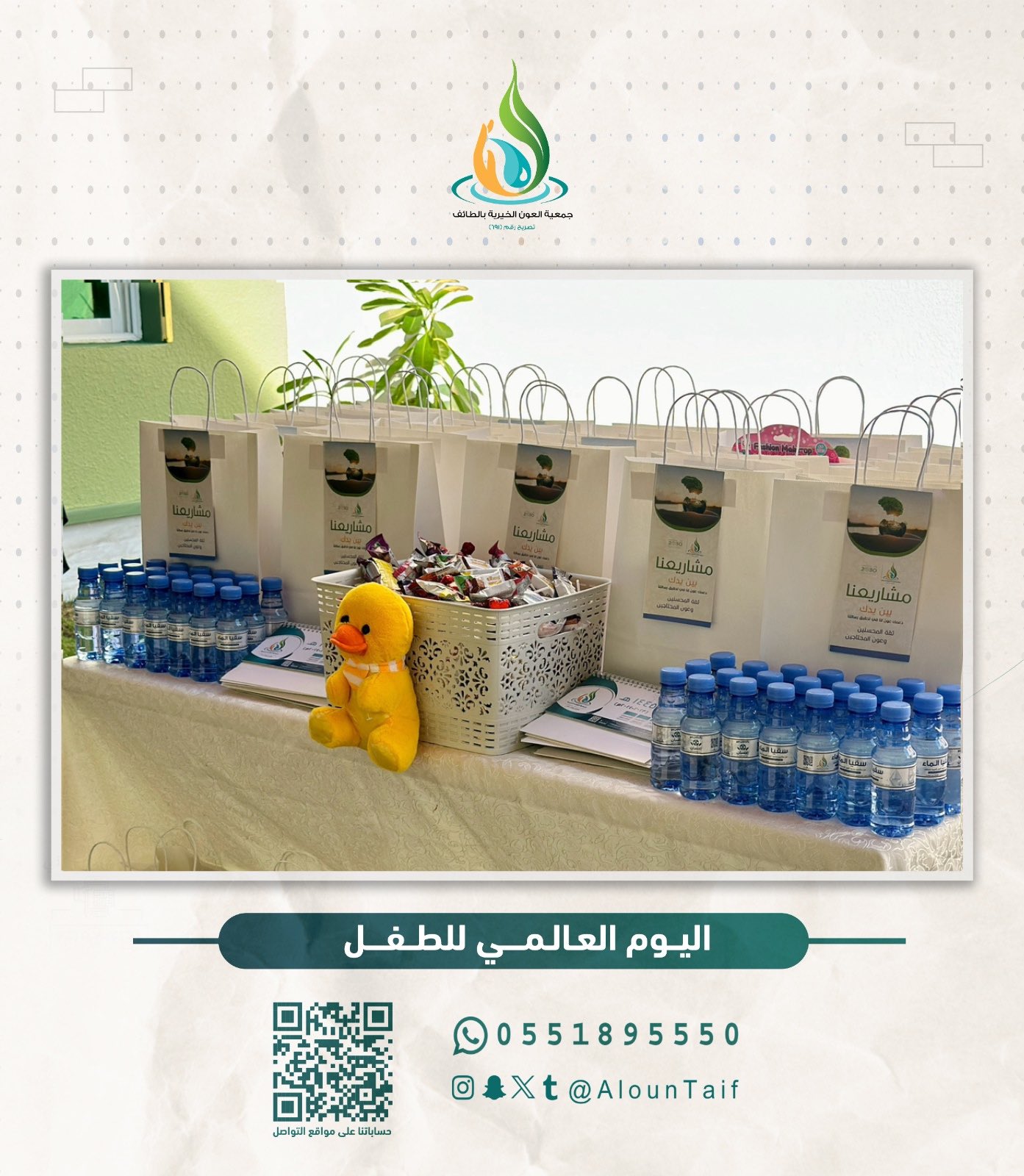 وسط ضحكات رُسمت ببراءة الطفولة و تزامنًا مع #يوم_الطفل_العالمي نفذت الجمعية مبادرة “صناع المستقبل” والتي كانت عبارة عن برنامج ترفيهي بالتعاون مع أمانة الطائف وجمعية أرزاق وجمعية فتاة ثقيف، تضمن مسابقات فنية وثقافية مصحوبة بجوائز عديدة ومتنوعة للأطفال وأبناء الأسر، وشاركت أيضًا بتنفيذ مبادرة في مستشفى الأطفال بالطائف حيث تم توزيع الهدايا على النزلاء لنزرع بقلوبهم الابتسامة ونرسم لهم مستقبل مليء بالأمل والسعادة .